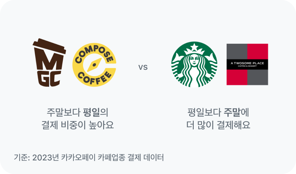 카페 브랜드와 가격대가 다양해지면서 우리의 선택지도 넓어졌어요. 각 커피 브랜드의 요일별 결제 비중을 살펴보면 메가커피와 컴포즈커피는 평일, 투썸플레이스와 스타벅스는 주말의 방문 비중이 높았어요. 평일 출근길에는 가성비 커피를 테이크아웃하고, 주말에 친구를 만나거나 여가 시간을 보낼 때는 자리가 넓고 디저트의 종류도 다양한 카페를 찾는 것으로 해석돼요.