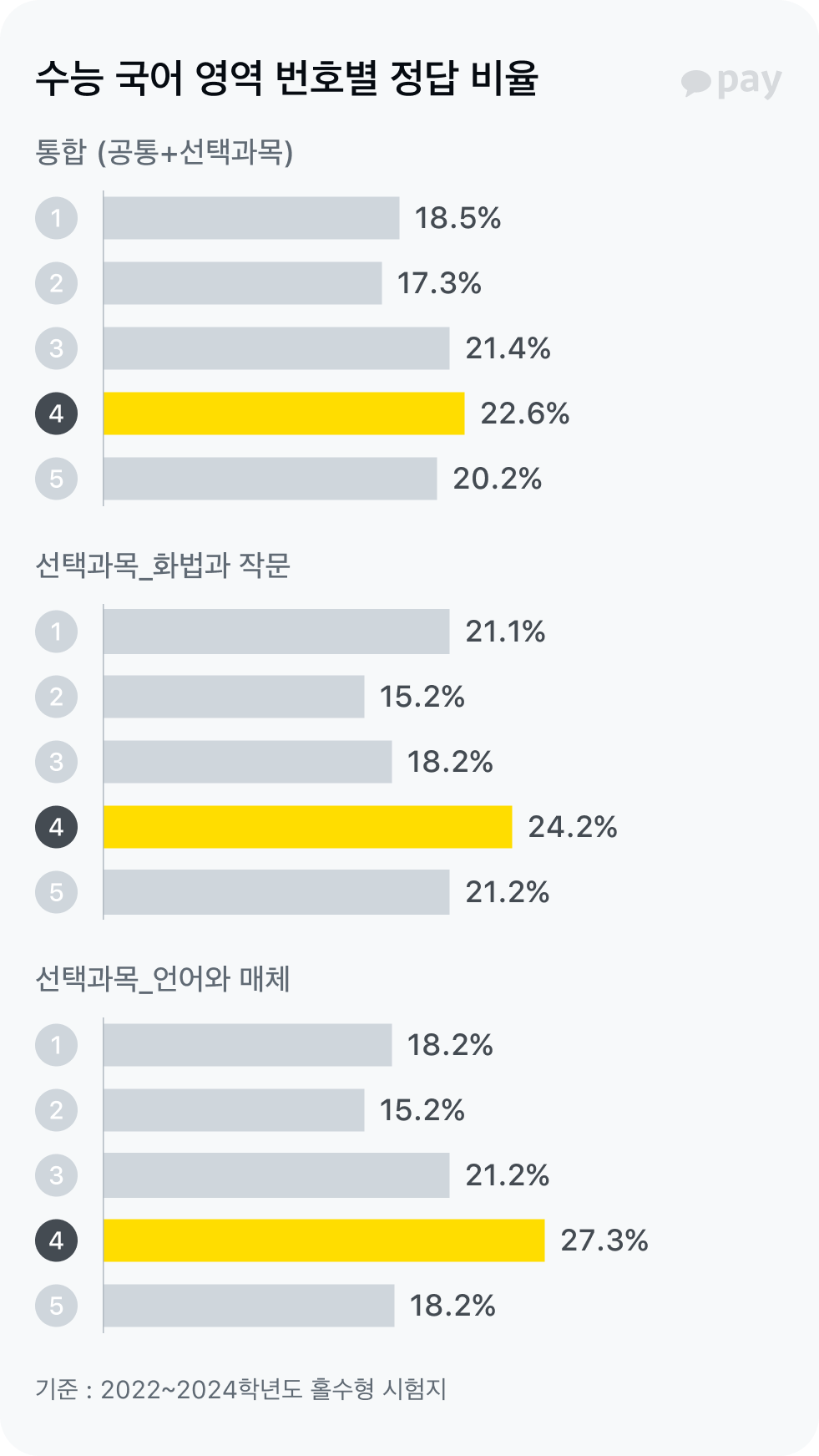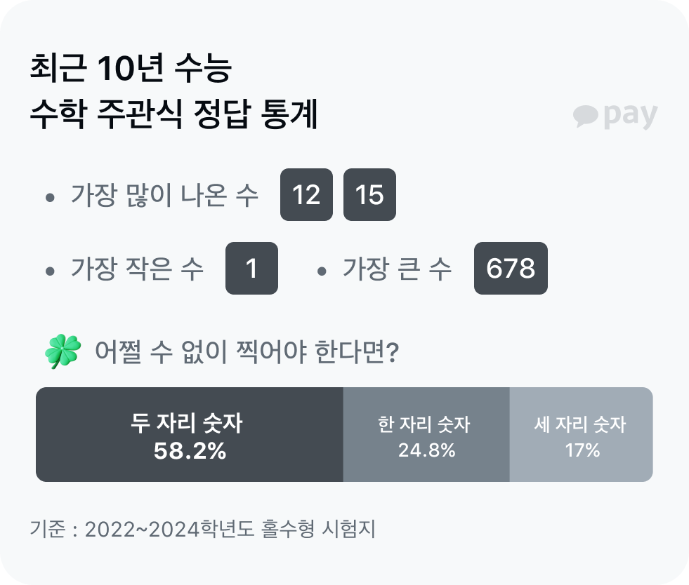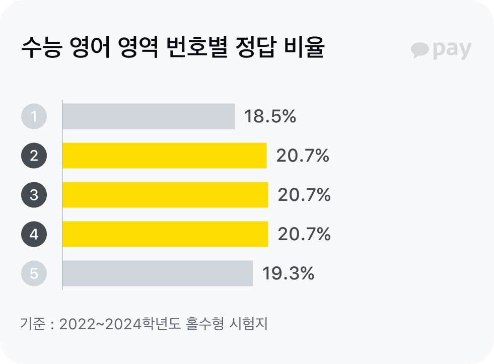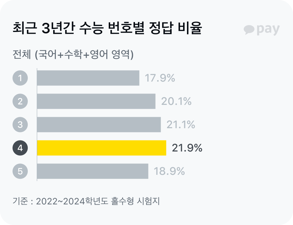 대망의 2025학년도 대학수학능력시험 날이 다가왔어요. 최선을 다해 문제를 풀어야 하겠지만 어쩔 수 없이 정답을 골라야 하는 순간이 올 수도 있는데요, 이럴 때 '찍기 전략’은 마지막까지 최선을 다 할 수 있는 힘이 되죠. 그런데 수능에서 번호 몇 번을 고르는 게 확률적으로 유리할까요? 카카오페이가 최신 수능 기출문제 정답을 분석해봤어요.