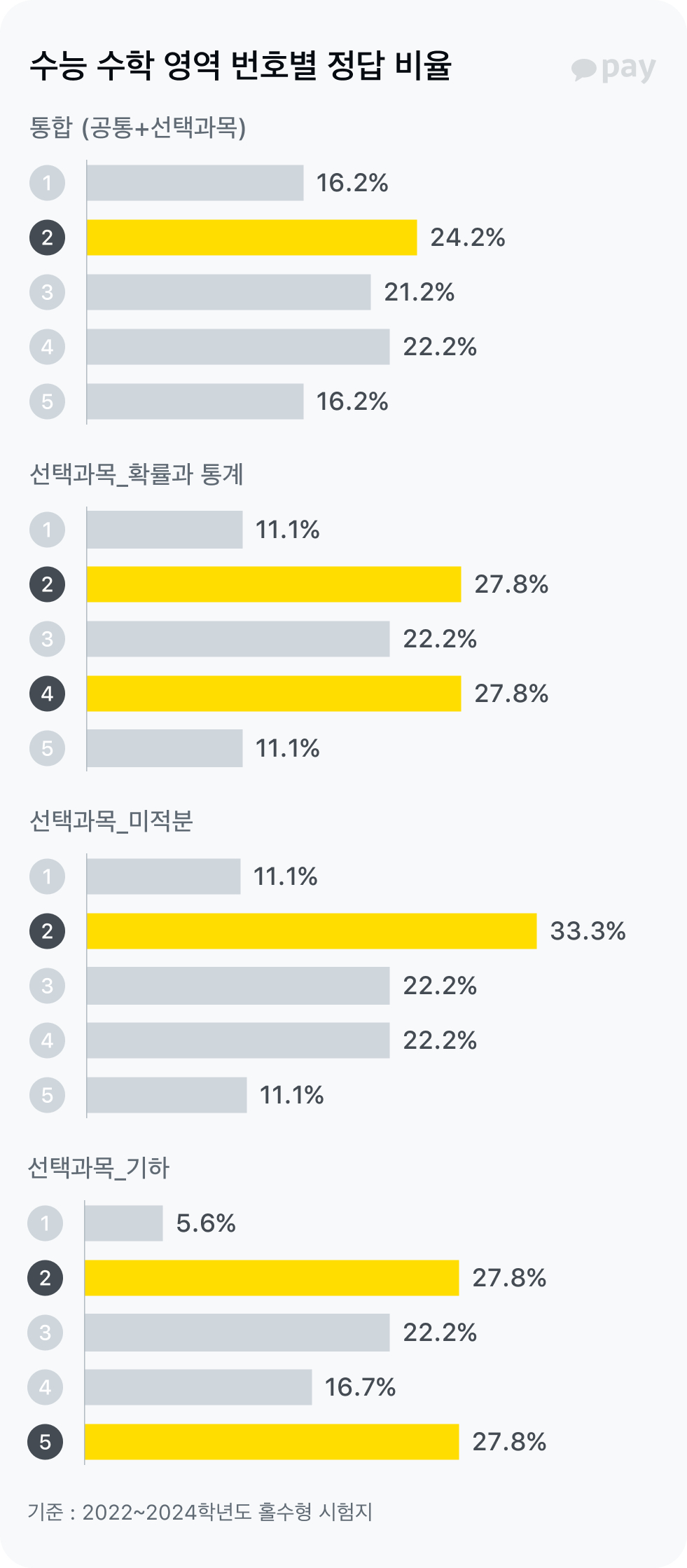반면에 수학은 완전 달랐어요. 수학 통합으로 보면 ②번이 가장 많긴 했지만 ②·③·④번이 비교적 균등하게 분포되어 있었죠. 선택과목 확률과 통계에서는 ②·④번 두 숫자가, 선택과목 미적분에서는 ②번이 월등하게 높았고, 선택과목 기하에서는 ②·⑤번이 많은 대신 ①번이 정답인 문제는 5%대로 아주 적었어요.