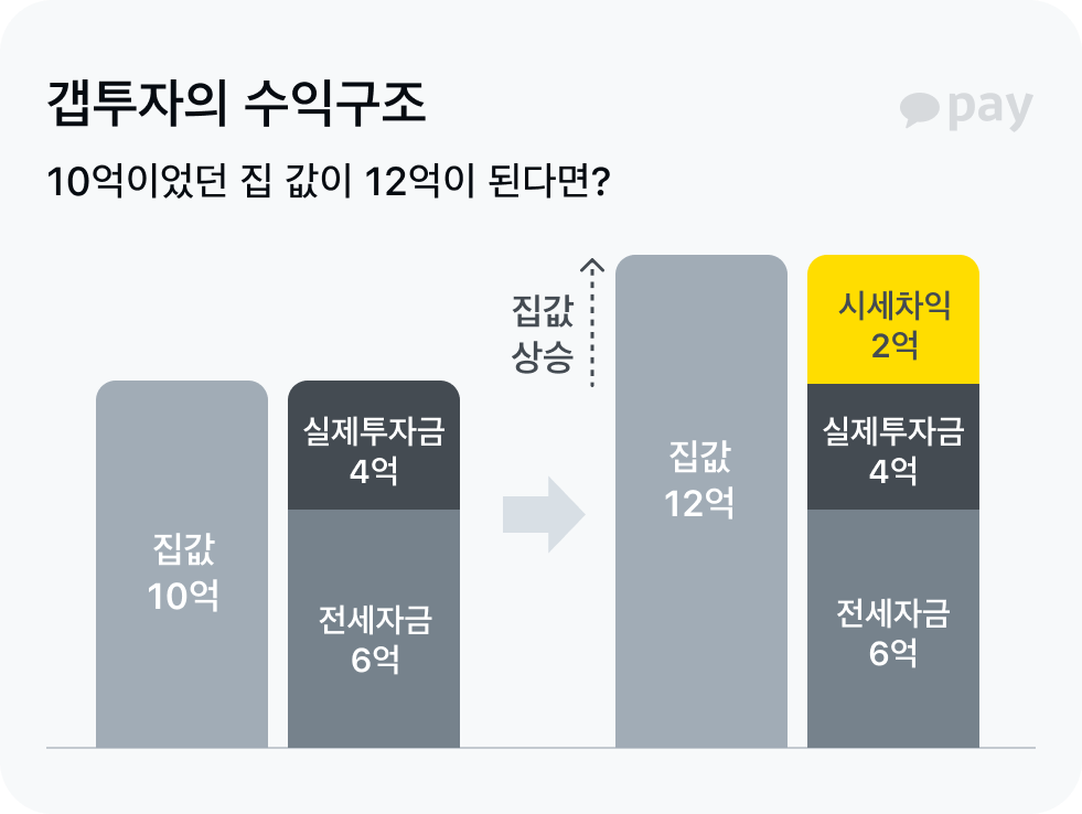 갭투자란 전세를 끼고 집을 사는 것을 의미해요. 예를 들어, 집값이 10억 원이고 전셋값이 6억 원이라면, 집을 살 때 10억 원을 전부 치르는 대신, 전세 보증금 6억 원에 내 돈 4억 원을 더해 집을 구매하는 건데요. 이렇게 하면 비교적 적은 자본으로도 고가의 주택을 구매할 수 있어요. 집주인에게 고액의 보증금을 맡기고 주택을 임차하는 전세 제도가 있기에 가능한 투자 방식이에요. 사람들이 갭투자에 나서는 건, 앞으로 집값이 오른다는 믿음 때문인데요.