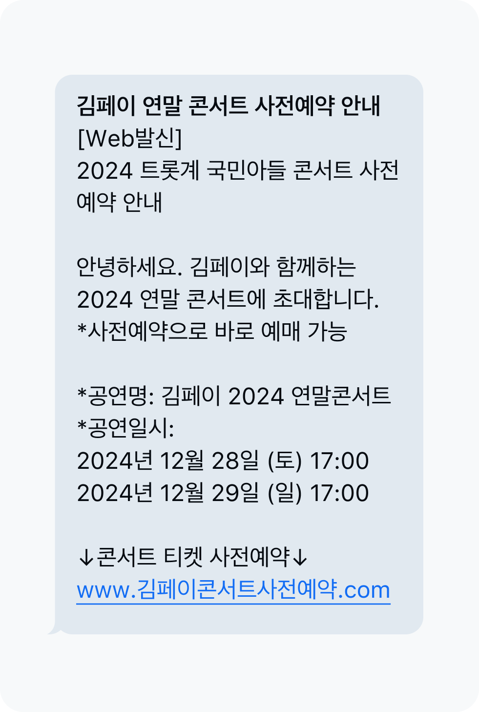 최근 많은 분들에게 유명한 트로트 가수의 연말 콘서트 사전예약을 가장한 스미싱 문자가 도착했어요. 워낙 티켓 예매가 어려운 공연이어서 혹하는 마음에 문자에 있는 인터넷주소(URL)를 누르는 경우가 있는데요, 절대 링크를 클릭하면 안 돼요. 누르는 순간 휴대폰에 악성앱이 설치되고 비밀번호 등 개인정보가 빠져나가 대형 범죄에 이용될 수 있어요. 이런 문자를 받았다면 바로 삭제하세요. 혹시 문자 내용이 궁금하다면 공식 예매 사이트에서 검색하는 게 좋아요.