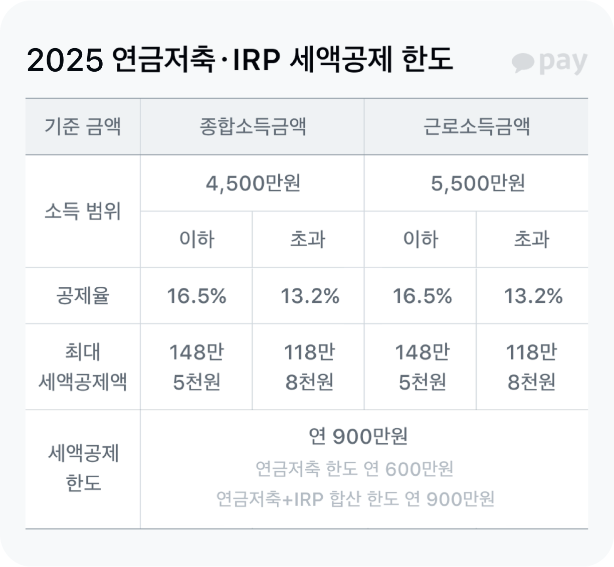 세액공제를 받을 수 있는 납입한도는 연간 연금저축 600만원, 개인형퇴직연금(IRP) 900만원이고, 두 상품을 합친 전체 한도는 연간 900만원이에요. 한도를 꽉 채워 넣으면 급여 5,500만원 이하인 분들은 148만 5,000원을, 5,500만원 이상인 분들은 118만 8,000원을 돌려받아요. 다른 세액공제보다 규모가 훨씬 큰 편이에요.