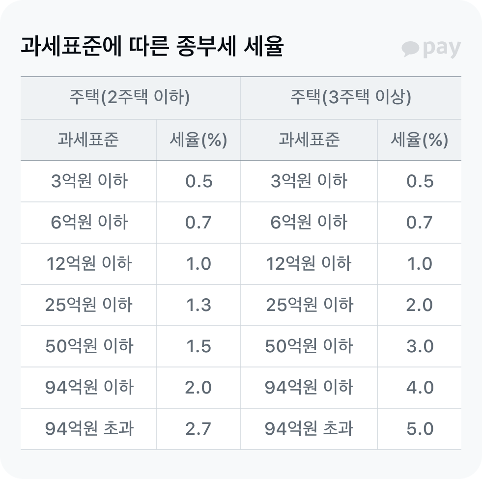 부부가 한 주택을 공동으로 소유한 경우는 1세대 1주택자로 인정받을 수 있어요. 공동 소유의 경우, 아내와 남편에게 종부세 기본공제금액 9억 원이 각각 적용돼요. 주택 공시가격이 18억 원일 때 한 사람이 지분을 100% 가지고 있다면 종부세를 내야 하지만, 아내와 남편이 절반씩 소유하고 있다면 종부세를 내지 않아요. 기본적으로 종부세의 세율은 과세표준에 따라 0.5%~2.7%로 나뉘어요. 주택을 3채 이상 보유한 경우엔 세율이 0.5%~5.0%로 높아지죠.