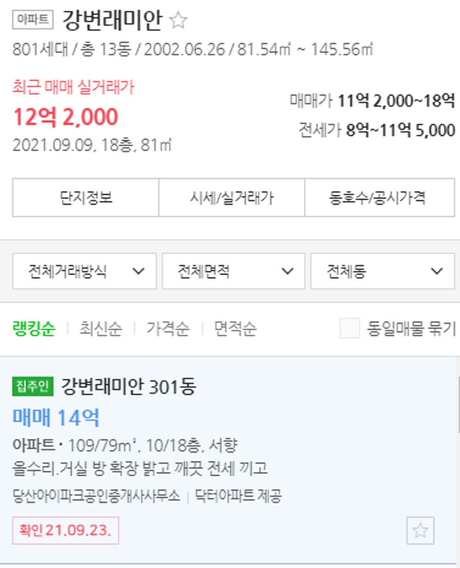 *2021년 9월 기준 실제 캡쳐본 입니다. 앞서 언급한 ‘오늘의 매도호가가 내일의 실거래가’ 란 말은 왜 나온 걸까요? 시장에 물건이 많으면 이런저런 흥정을 하면서 가격을 깎기도 합니다. 그런데 인기 좋은 물건이 1개만 나왔다? 주인이 부르는 값 그대로 지불해야 되죠. 지금 부동산 시장이 딱 그렇습니다. 집을 팔겠다는 사람이 없어도 너~무 없죠. 그러다 보니 14억 부르는 집주인이 나타나자마자 ‘흥정은 무슨, 내가 살게!’ 라며 바로 거래가 체결되니, 호가=실거래가 현상이 일어나는 것이죠.