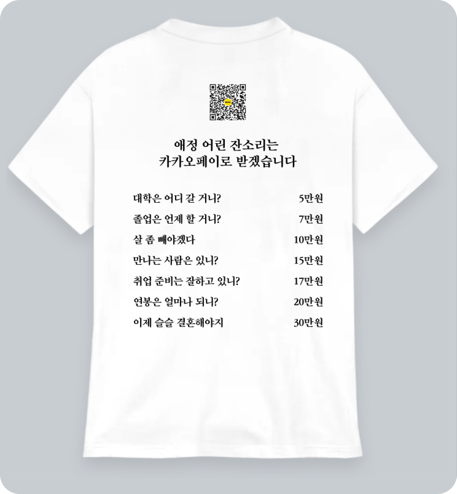 송금은 QR코드로 간편하게 받을 수 있어요. 이 정도 금액을 내고서라도 잔소리를 하겠다는 분들이 있다면, 기꺼이 들어드리는 것도 나쁘지 않을 것 같죠? 이번 설날, 벌써부터 잔소리 폭탄이 걱정된다면 이 티셔츠를 준비해 보세요. 새로 나온 송금봉투를 구경만 해도 자동으로 응모된답니다!