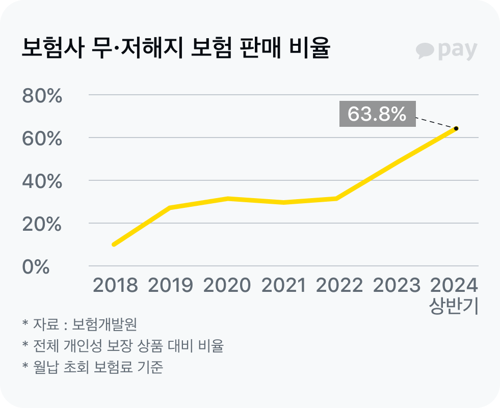 보험개발원에 따르면 2024년 상반기에 보험에 가입한 사람 중 64%가 무해지 보험과 저해지 보험에 가입했다고 밝혔어요.