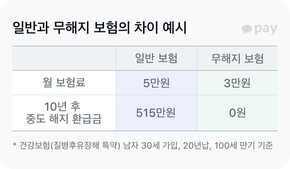 무해지 보험은 일반 보험과 같은 보장을 가지고 있지만 해지 환급금이 없어서 보험료가 평균 33% 정도 저렴한 상품을 말해요. 예를 들어, 5만 원씩 20년간 납입하는 보험을 무해지 보험으로 가입하면 약 400만 원 덜 내고도 동일한 보장을 받는 거예요.