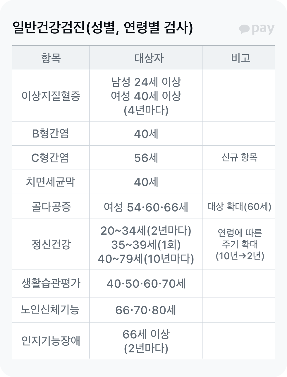 검진은 공통적으로 신체 검사, 시력 및 청력 검사, 혈압 검사, 흉부 엑스레이 촬영, 소변 검사, 구강검진, 진찰 및 상담 등으로 이루어져 있어요. 성별과 연령에 따라 자주 생기는 질병이 조금씩 달라서, 개개인에 따라 추가 검진 항목이 있는데요, 올해부터 새롭게 추가되거나 확대되는 항목이 있어요.