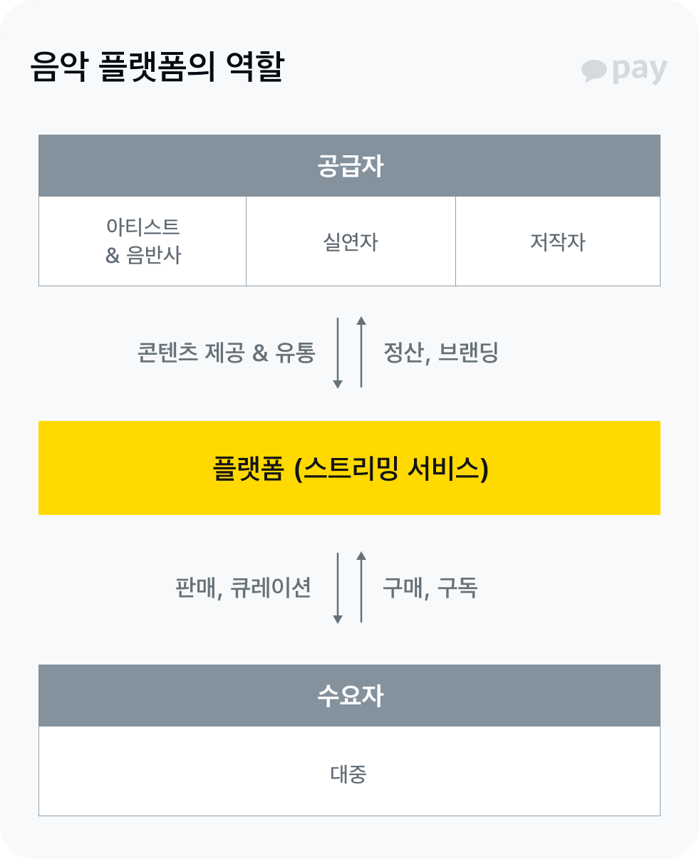 음악 스트리밍 서비스는 아티스트 및 레이블이라는 공급자와 청취자라는 수요자를 연결하여 음악이라는 재화를 효율적으로 거래할 수 있도록 중개해요.