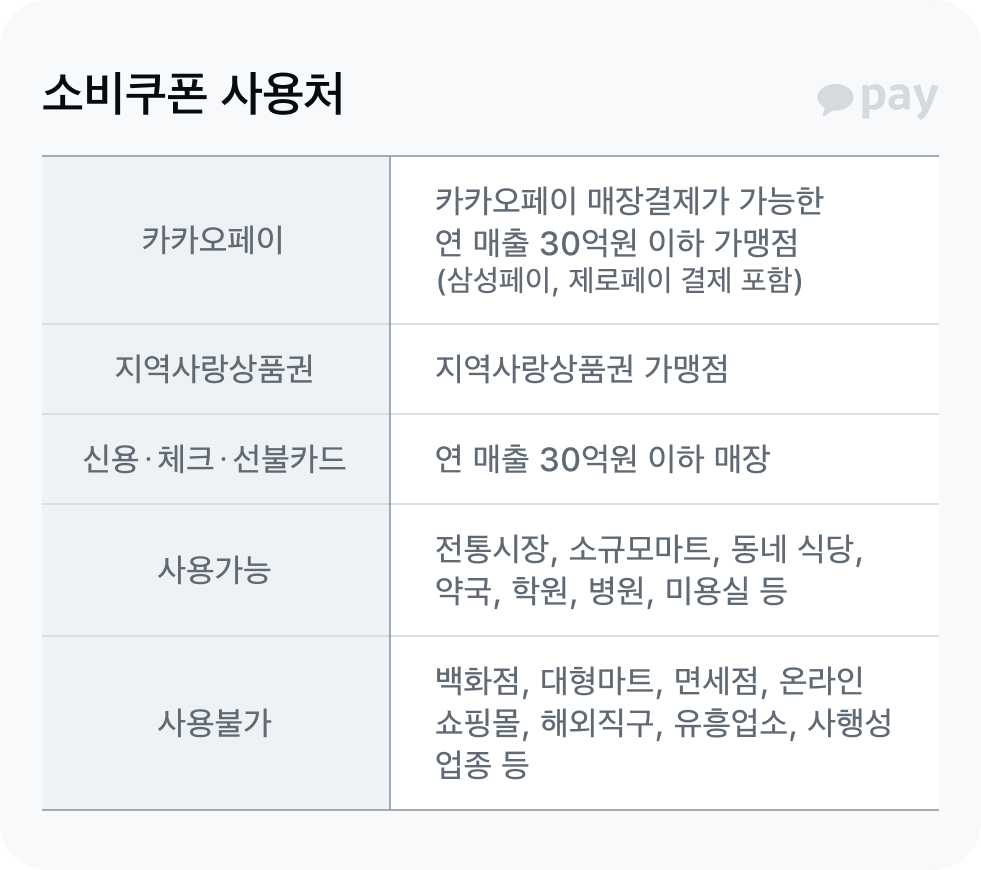 Q. 마트에서는 못 쓰나요? 대형마트, 기업형 슈퍼마켓, 백화점 등에서는 사용할 수 없고, 전통시장과 동네마트에서는 사용할 수 있어요. 편의점이나 프랜차이즈 업체의 경우 직영점에서는 사용이 불가하고, 가맹점에서는 사용 가능해요. 배달앱이나 쇼핑몰 등 온라인전자상거래 업체에서는 쓸 수 없어요.