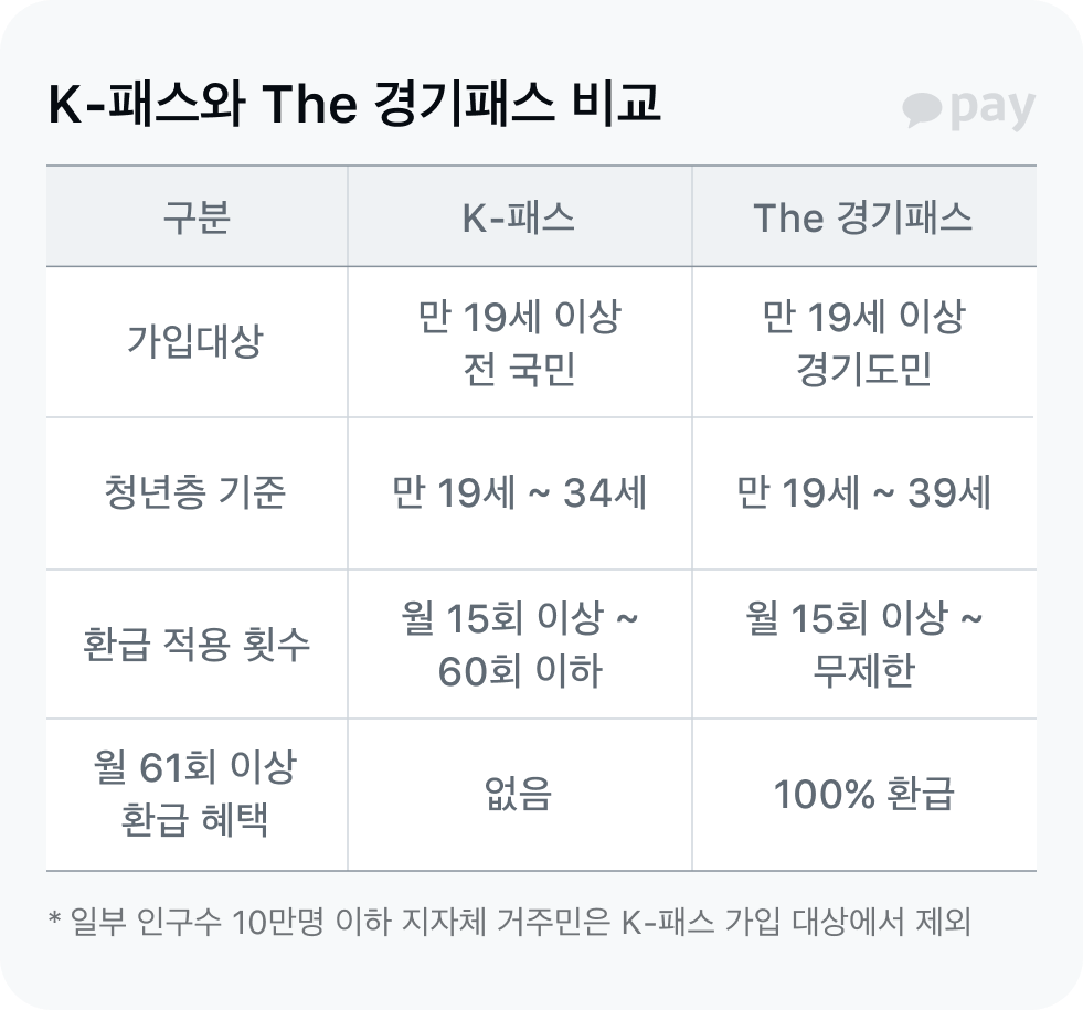 경기도민은 60회까지 K-패스로 환급받을 수 있고, 61회부터는 100% 무제한 환급받을 수 있어요. (단, 이용 시기가 아닌 높은 금액 순으로 정렬) 또 청년 혜택도 만 39세까지 받을 수 있죠. 교통비가 올라 부담된다면, K-패스로 절약해보세요.