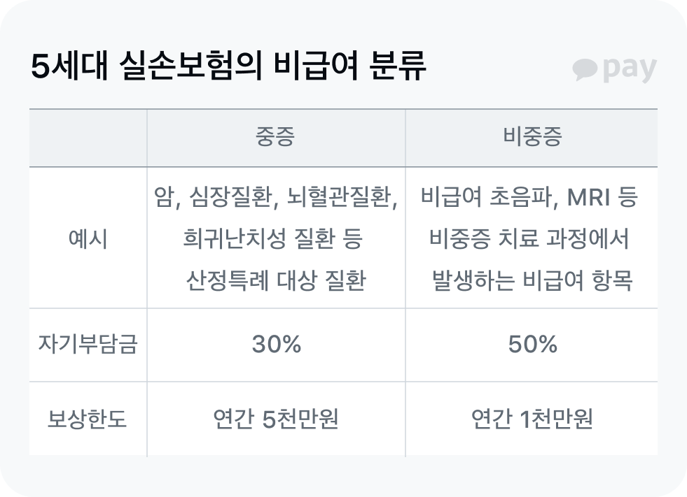 두번째로 주목해야 할 변화는 비급여 보장 구조가 개편된다는 거예요. 그동안 실손보험은 비급여 항목이라면 보장을 받을 수 있어 경제적인 부담을 줄여줬어요. 그런데 5세대는 같은 비급여 항목이라고 하더라도 질환이 얼마나 심각하냐에 따라 보장 내용이 달라져요.