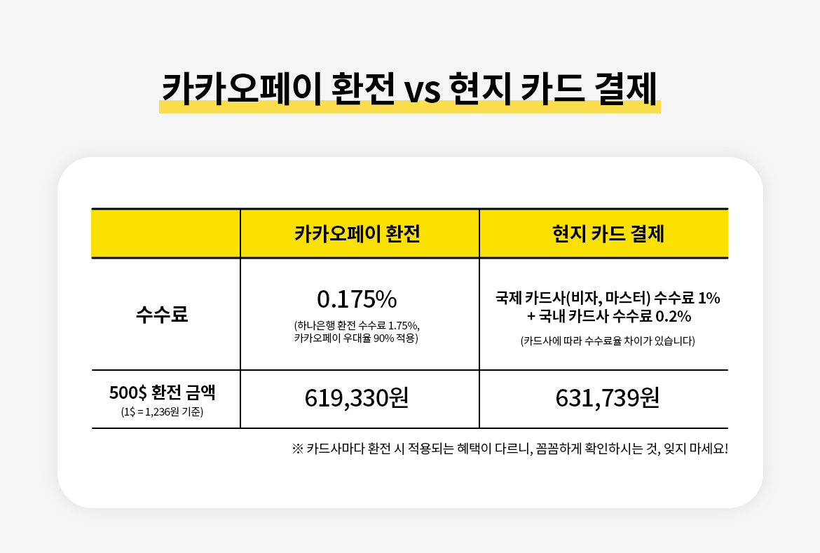 확실히 환전이 더 저렴한 것이 보이죠? 환율 우대를 받을 수 있는 경우, 신용카드를 사용하는 것보다 환전을 하는 것이 더 유리해요.