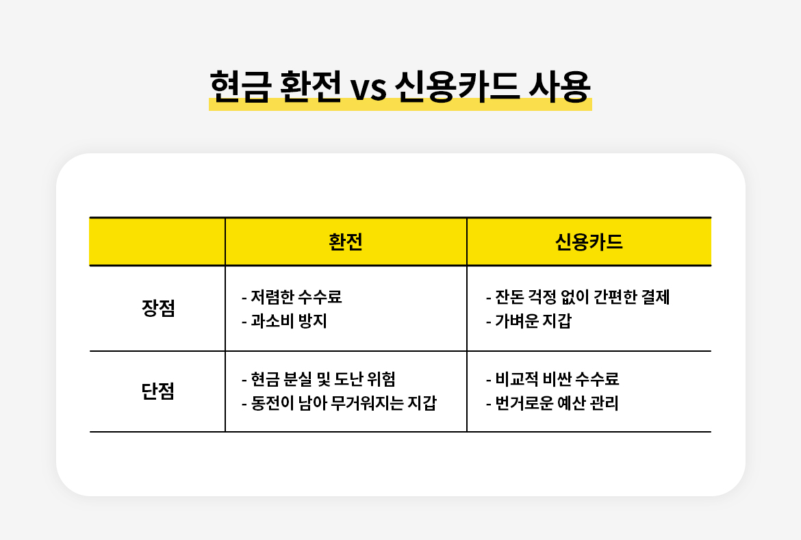해외여행 전 이런 고민해본적 있으실거예요. 💵수수료 아까워! 전부 현금 환전~ vs 💳그러다 도둑맞으면? 신용카드가 최고! 뭐가 더 유리할까요? 이 글을 다 보면, 환전과 신용카드 중 해외결제 수단을 결정하는 데 도움될거예요.