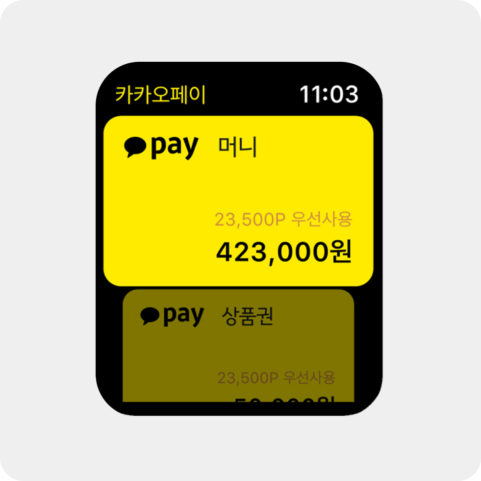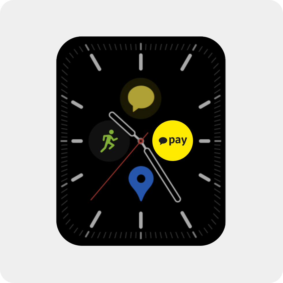 워치페이스에서 카카오페이 누르면 단 한 번의 클릭으로 결제 끝⚡️ 이제 애플워치로 더 빠르고 멋지게 결제해요.