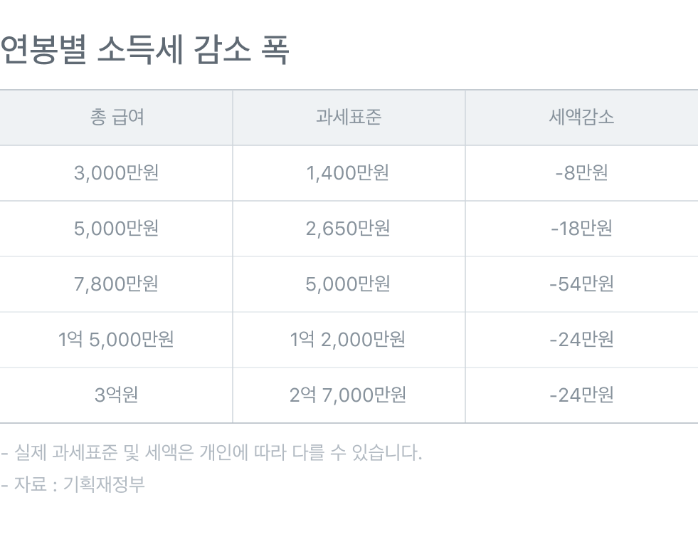 연봉별로 소득세 감소폭은 조금 차이가 있어요. 가장 큰 효과를 보는 건 과세표준 5,000-8,800만원, 연봉으로는 약 7,800-1억2,000만원 구간에 있는 사람들이에요. 소득세가 연 54만원이나 줄어들어요.