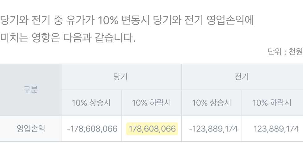 항공사는 대형 항공기를 외화로 빌려서 운영을 하니 외화부채가 커요. 환율이 10% 오르면(원화 10% 약세) 달러 관련 자산·부채에선 4,853억원, 유로화 관련해서는 1,049억원 손실이 납니다. 덤으로 국제 유가가 치솟고 있으니 대한항공의 유가 변동 위험도 살펴볼게요. 비행기는 기름을 많이 먹으니까요.