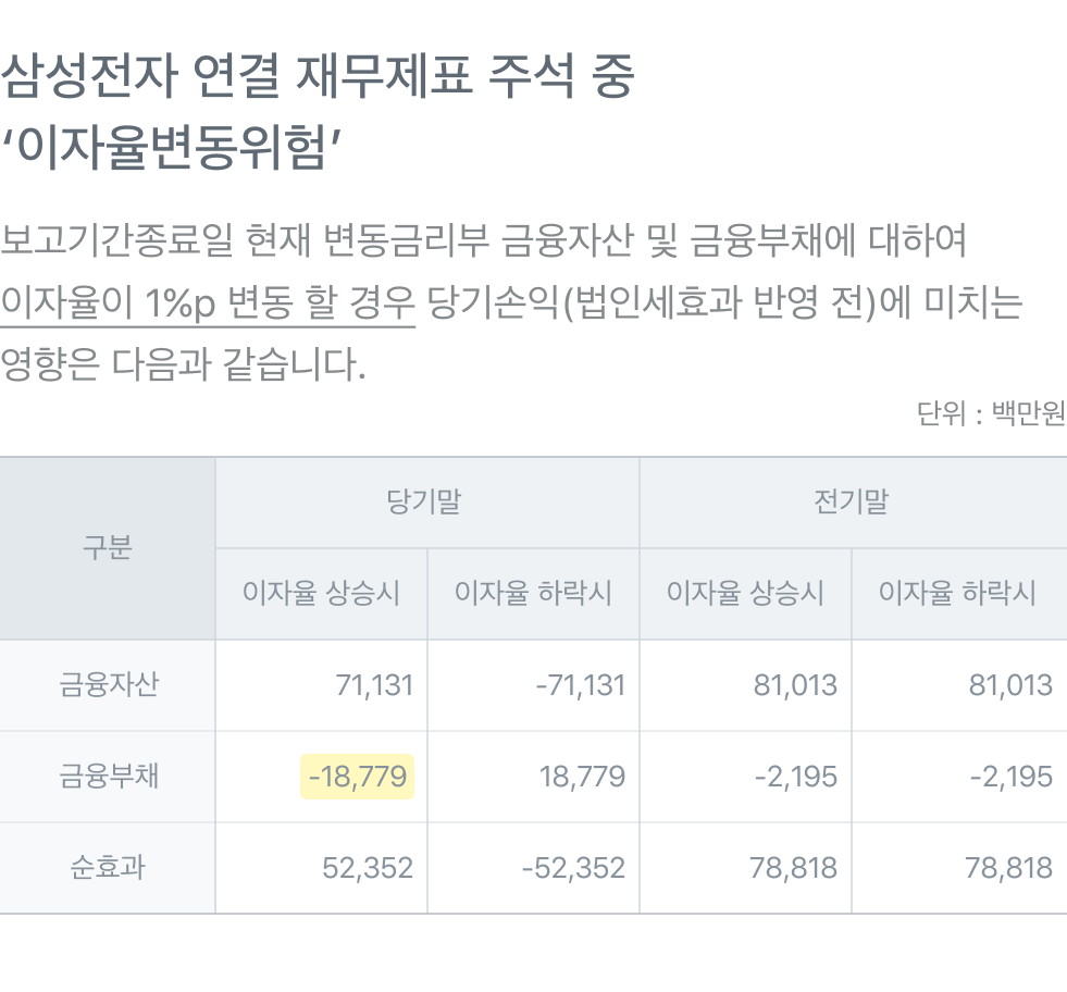 결산 시점보다 금리가 1%포인트 오르면 빚 때문에 당기손익에서는 188억원 손실이 난다는 걸 알 수 있죠. 다만 금리가 오를 때 오히려 이익을 보는 금융자산도 많아서 오히려 금융자산·부채 전체로는 이득인 구조예요. 삼성전자는 작년 한 해 당기순이익만 40조원을 냈으니 저 정도 손익은 큰 영향을 주지 않아요.