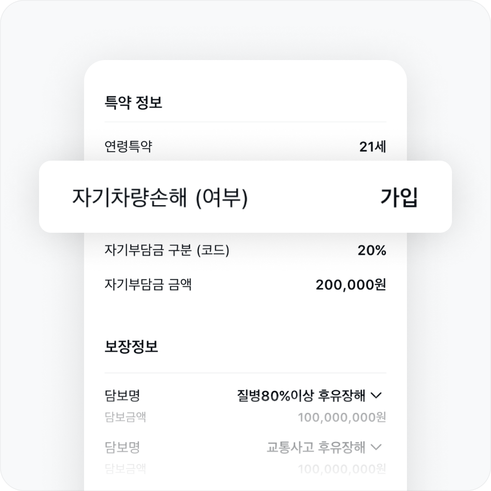 내가 가입했는지는 어떻게 확인하죠? 🤔 먼저 자동차보험이 있다면 카카오페이에 마이데이터를 연결해보세요. 내 보험 > 연결한 자동차 보험을 눌러 상세 정보에 들어가면 자기차량손해 담보에 가입했는지, 자기부담금 비율은 얼마인지 확인할 수 있어요.