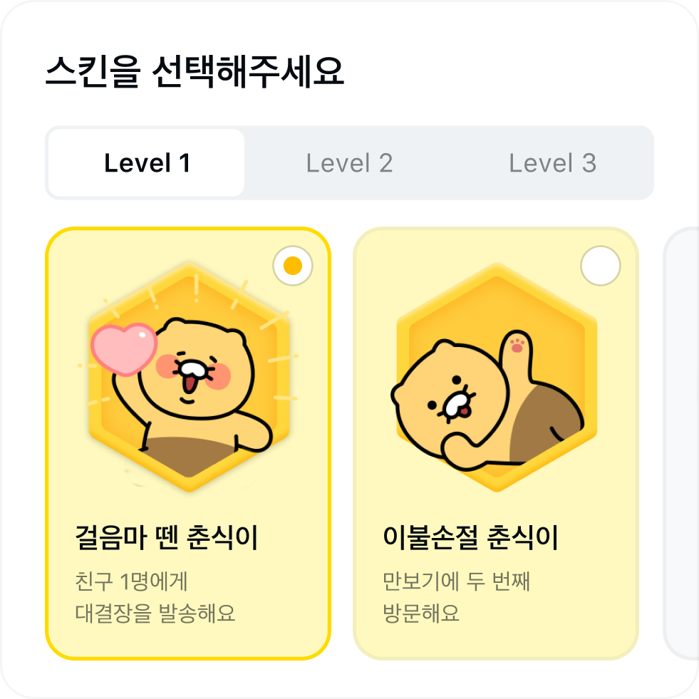 걷다 보면 귀여운 춘식이를 모을 수 있어요. 미션을 달성할 때마다 새로운 춘식이 스킨이 기다려요.