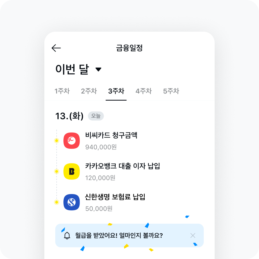 바쁜 일상 속 하나하나 기억하기 어려운 금융일정도 미리미리 알려드려요. 신나는 월급날부터 카드 결제일, 대출이자 내는 날, 보험 만기일까지 다가올 일정을 한번에 확인할 수 있어요.
