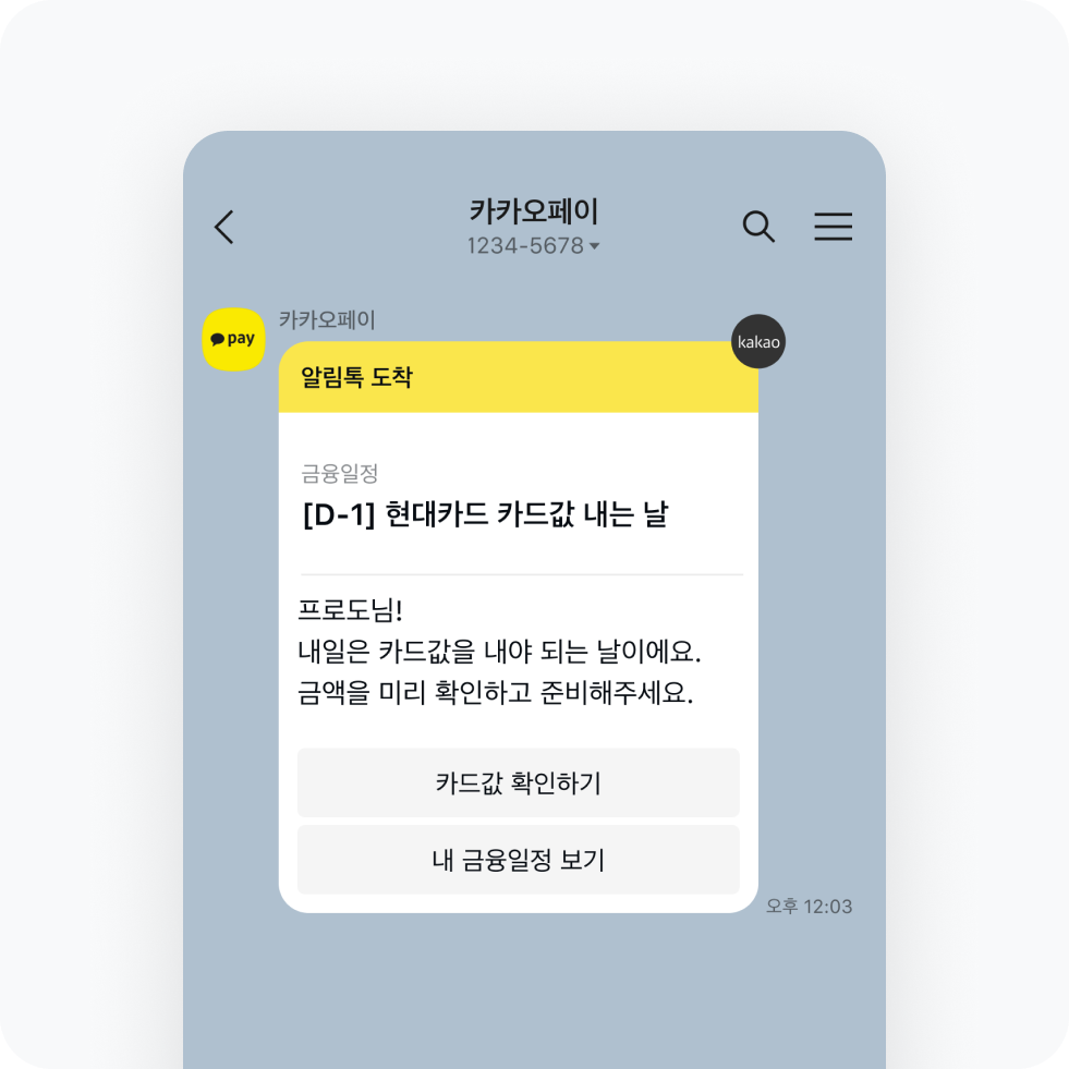 바쁜 당신을 위해! 꼭 필요한 일정은 카톡으로 한번 더 알려드려요. 깜빡하고 카드 결제일 놓칠 걱정도 이젠 끝. 금융일정과 함께라면 손으로 쓰는 가계부보다 훨씬 더 똑똑하게 내 수입과 지출을 관리할 수 있어요. 이제 자산 관리는 나보다 날 더 잘 아는 페이에게 맡기세요!
