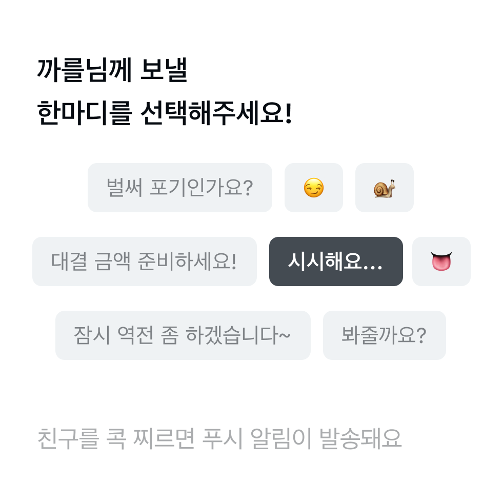 귀여운 춘식이가 걸음수를 세어주고 오늘 누가 더 많이 걸었는지 보여줘요. 대결 중인 친구를 자극하는 한마디도 던질 수 있어요.