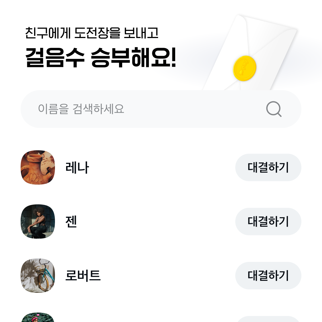 함께하면 더 즐거운 운동! 걷기왕춘식이 만보기에서는 친구들과 걷기 대결을 할 수 있어요. 대결을 위해서는 도전장이 필요해요.