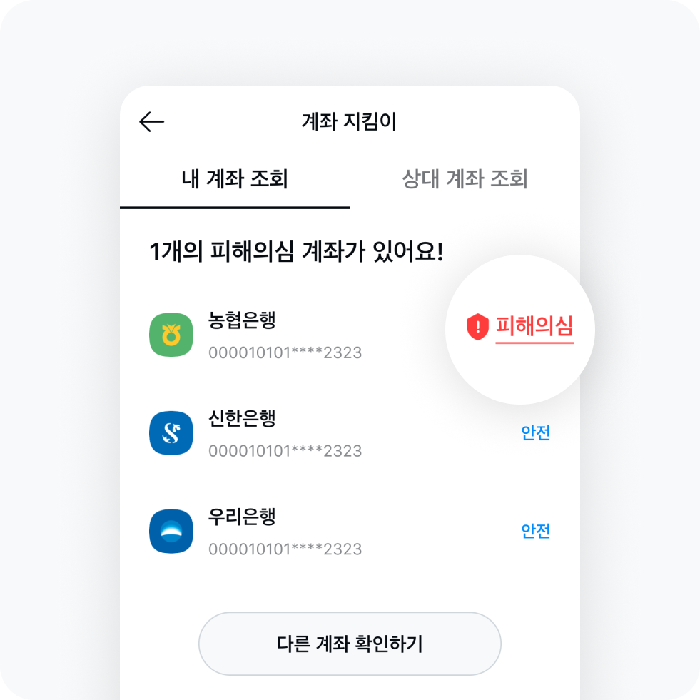 내 계좌 뿐 아니라 상대방의 계좌도 조회해볼 수 있어요. 중고거래 전 유용하겠죠? 한 해 평균 30만건이 넘는 사기가 일어나는 지금, 나도 모르게 언제 내 계좌가 도용될 지 몰라요. 계좌 지킴이로 미리 확인하고 안전하게 거래하세요!