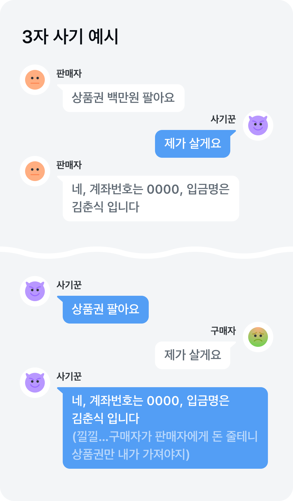 판매자와 구매자 모두를 속이고 물건만 가로채는 신종 수법이에요. 사기꾼이 실제 물건의 판매자와 구매자인 피해자 2명을 모두 속이고 중간에서 물건만 가로채는 거죠.