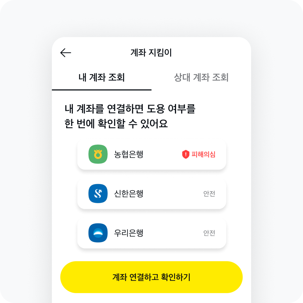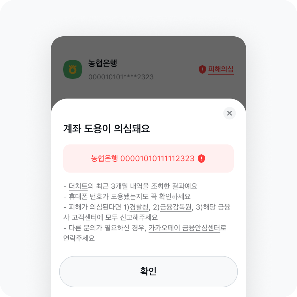 지금 카카오페이에 계좌 연결하면 내 계좌가 신고당한 적 있는지 확인할 수 있어요. 피해가 의심되면 관련 기관의 연락처도 보여줘요.