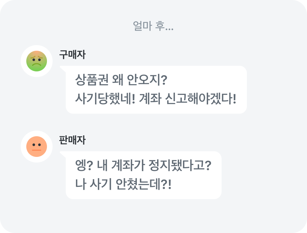 계좌로 돈을 받고 사기꾼에게 물건을 보낸 판매자는 나도 모르게 사기에 연루돼요. 구매자가 계좌를 신고하면 계좌 거래가 정지되는 등의 불편을 겪을 수도 있어요.