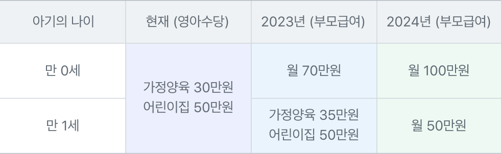 지금까지는 만 0세와 1세 아이를 가정에서 키울 때는 월 30만원을, 어린이집에 다닐 때는 50만원의 어린이집 이용비용을 지원했어요. 2023년부터 만 0세는 어린이집 여부에 상관없이 매달 70만원을 지원하기로 했어요. 만 1세는 가정양육을 할 경우 35만원, 어린이집에 다닐 경우 50만원 지원으로 금액이 조금 늘어나요. 2024년부터 만 0세는 월 100만원, 만 1세는 월 50만원의 부모급여를 지급할 계획이에요.